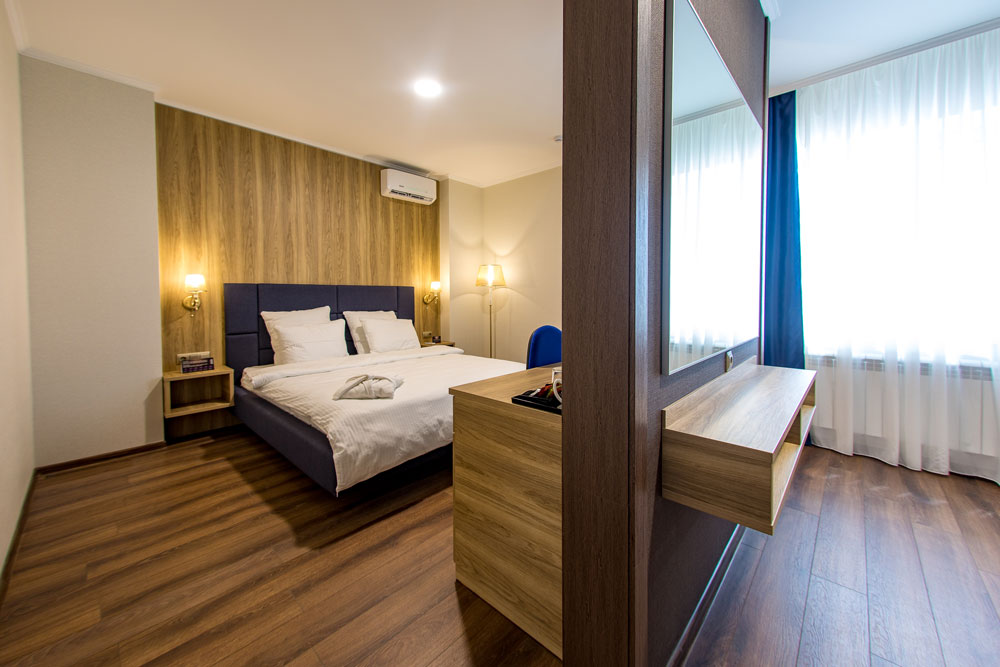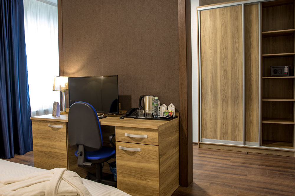 • в номерах есть телефон, кондиционер, телевизор, фен, мини-холодильник, сейф, шкаф, прикроватные тумбочки, настольная лампа и зеркало